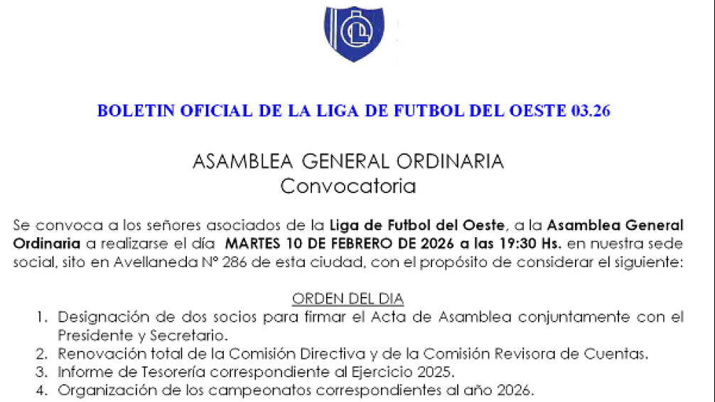 Se convoca a los señores asociados de la Liga de Futbol del Oeste, a la Asamblea General Ordinaria a realizarse el día MARTES 10 DE FEBRERO DE 2026 a las 19:30 Hs. en nuestra sede social, sito en Avellaneda Nº 286 de esta ciudad, con el propósito de considerar el siguiente: